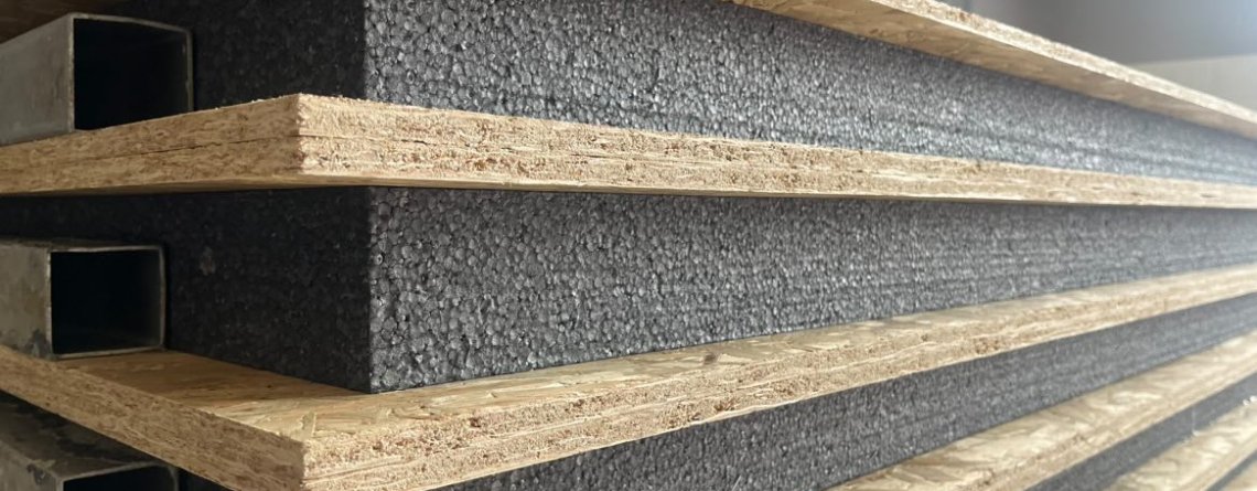 Each panel is pressed under extreme pressure to bond the OSB3 layers to the insulation core using specialist adhesive. Once cured, the result is a solid, load-bearing panel that performs similarly to a steel I-beam — offering both strength and thermal efficiency.